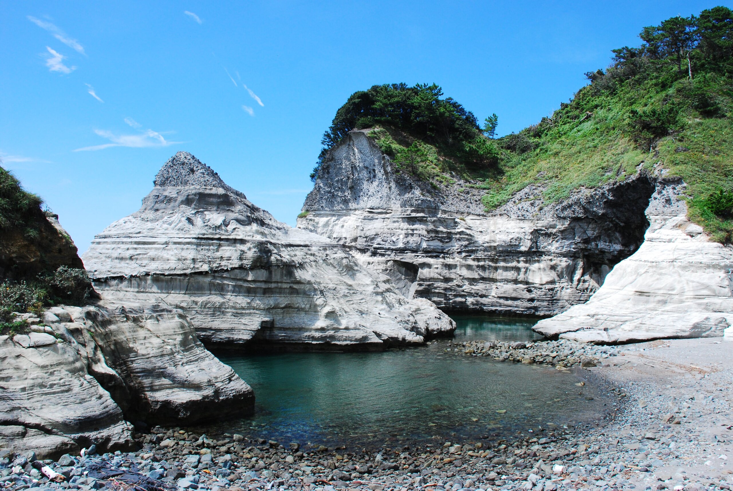 仁科漁港を波から守る岬の先端は、枯野公園(地元では「かるの」「かれの」「からの」と呼ばれる)といいます。ここでは波濤による侵食が絶えず続き、常に新しい断面の地層を観察できます。園内の鍛冶屋浜(かんじゃま)の手前に浮かぶ小さな島は兜岩(かぶといわ)と呼ばれています。